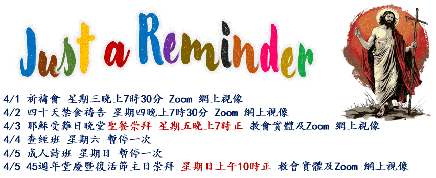 2026年4月5日(星期日)上午10時正復活節及45週年堂慶崇拜,教會實體及Zoom 網上視像。